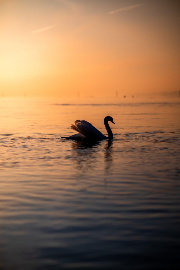 Der Schwan zieht elegant seine Bahn auf dem See, eingefasst von Blau und Orange – eine harmonische Begegnung von Licht, Farbe und Bewegung.