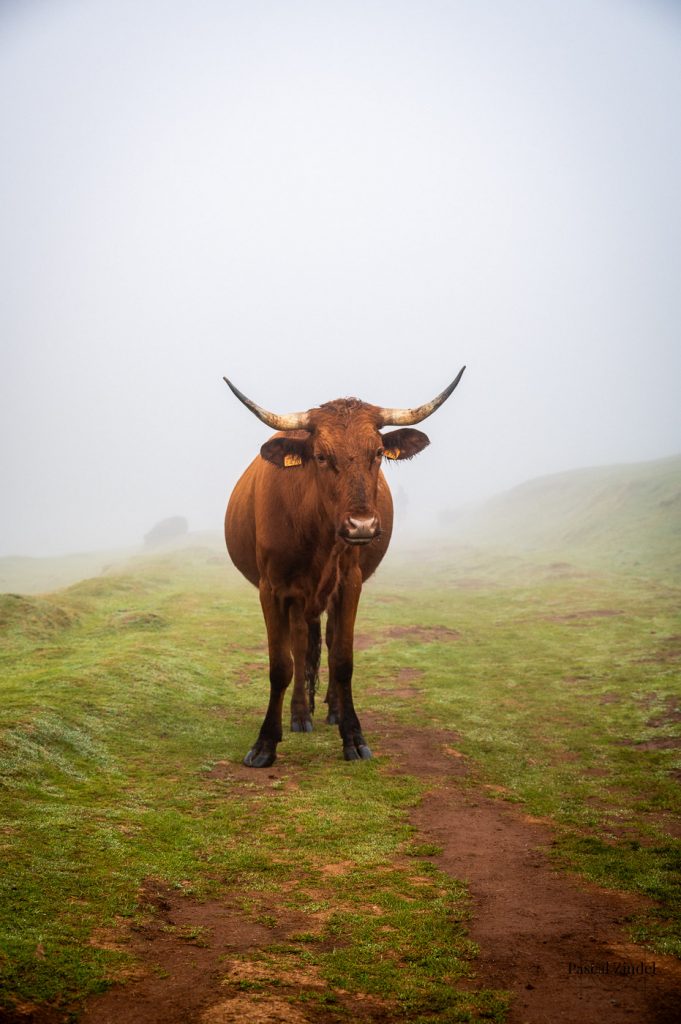 Der Stier steht ruhig auf der nebligen Wiese, seine Präsenz und die imposanten Hörner verleihen der Szene eine fast märchenhafte Ruhe.